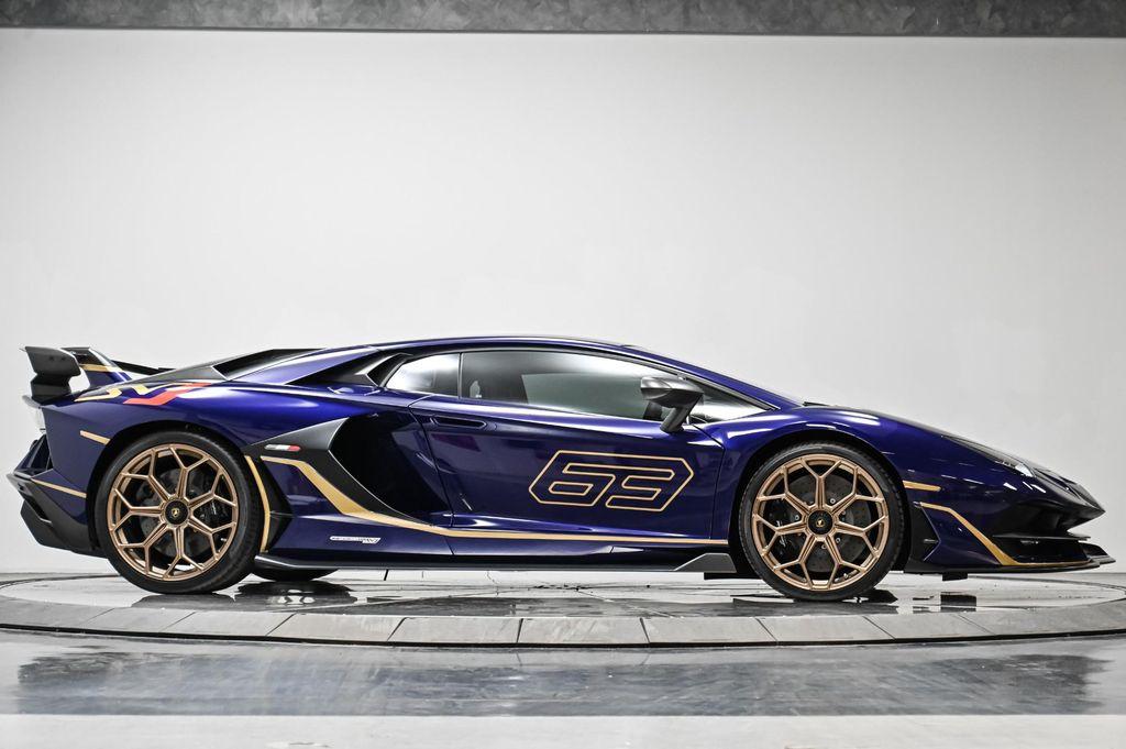 There are bold additional details. Black Lamborghini brake calipers, a full Carbon Fiber monocoque chassis, Carbon Fiber lip, diffuser, splitter, and skirts. The bronze SVJ decal on the upper rear quarter topped off with the number ''63'' along the doors. Only 63 units units of this anniver View More