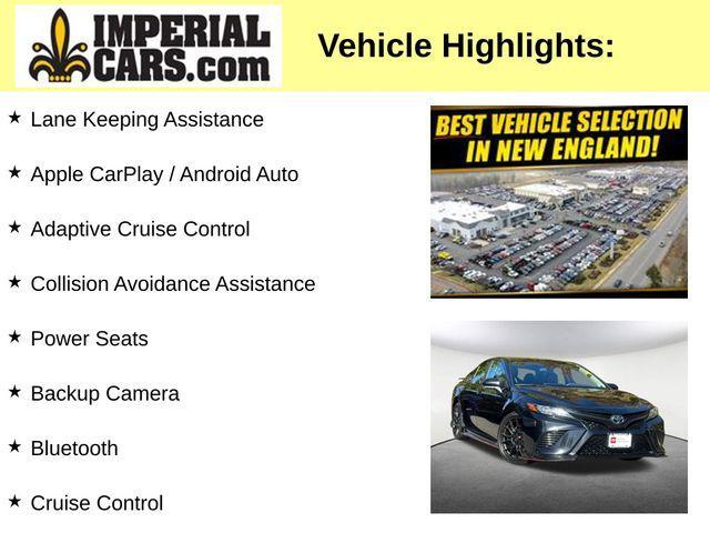 Lane Keeping Assistance, Apple CarPlay / Android Auto, Adaptive Cruise Control, Collision Avoidance Assistance, Power Seats, Backup Camera, Bluetooth, Cruise Control, Power Windows, Power Locks, Steering Wheel Radio Controls, Aluminum Wheels, Black Artificial Leather, ABS brakes, Active Cruise Control, Alloy wheels, Electronic Stability Control, Front dual zone A/C, Heated door mirrors, Illuminated entry, Low tire pressure warning, Remote keyless entry, Traction control. Midnight Black Metallic 2022 Toyota Camry TRD V6 TRD V6 4D Sedan 3.5L V6 DOHC 24V FWD 8-Speed AutomaticMORE ABOUT US: Imperial Cars Purchase With Confidence: 1) Free Car Fax Vehicle History Report available for all our vehicles online. 2) Our vehicles are Imperial Certified and go through a rigorous 125-Point vehicle inspection. 3) Bottom line pricing. 4) 5-Day or 200 Mile Vehicle Exchange Program for your total confidence. If you are not happy with it bring it back within 7 days or 200 miles and we'll give you a credit of your full purchase price toward the purchase of another vehicle. (Excludes Renewed for You vehicles.)Please be aware that the price listed for the vehicle does not include tax, title, registration, documentation fee, or any other applicable fees. However, it does include a trade-in assistance bonus of $1,000 for qualifying retailable trades with less than 10 years of use from the original in-service date. To be eligible for the advertised promotional price, you must pay in full and take delivery of the vehicle from dealer stock on the same day. For the most up-to-date information and Imperial discounts, please call or email our phone and internet team. Please note that the price cannot be combined with any other discounts or promotions and is subject to change based on the market value at any time without notice. To receive the internet special discount, please mention the promo code INTERNET1. While we strive to provide reliable information, please note that the dealer is not responsible for any misprints involving the price and/or description of any vehicle offered for sale. It is your sole responsibility to inspect and verify such information before making a purchase. We want to be transparent in our dealings, and to that end, you can call 800-526-AUTO (2886) to receive your personalized ''Buy-For-Price.'' Lastly, please note that we do not sell to wholesalers or dealers, and some of our pre-owned vehicles may be subject to unrepaired safety recalls. To check if any vehicle has unrepaired recalls, you can look up the vehicle's VIN at https://www.nhtsa.gov/recalls. Some of our Pre-Owned vehicles may be subject to unrepaired safety recalls. Check for a vehicles unrepaired recalls by VIN at http://vinrcl.safercar.gov/vin/