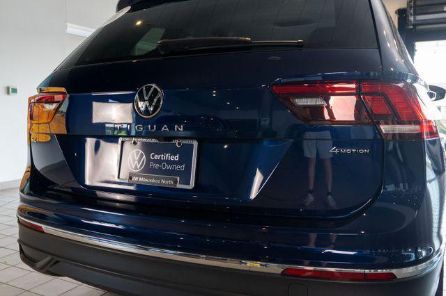 Volkswagen Certified with at least 2 years or 24,000 miles (whichever comes first) of warranty!, Clean Carfax, Dealer Maintained, Local Trade, Discover the perfect blend of style, performance, and reliability with the Volkswagen Certified 2022 Volkswagen Tiguan 2.0T SE, now available at Volkswagen of Milwaukee North. This stunning SUV features a sleek Atlantic Blue Metallic exterior paired with a refined Storm Gray interior, offering a bold yet sophisticated look. Equipped with the sought-after SE Package, this Tiguan delivers enhanced technology, advanced safety features, and premium comfort for every drive. Backed by Volkswagen's Certified Pre-Owned program, you'll enjoy added peace of mind with a thorough inspection and extended warranty coverage. Visit our Milwaukee dealership today to experience this exceptional 2022 Tiguan SEwhere quality meets value in a stylish, versatile SUV., AWD. Odometer is 19772 miles below market average! Priced below KBB Fair Purchase Price!Certified. Atlantic Blue Metallic 2022 Volkswagen Tiguan 2.0T SE 22/29 City/Highway MPGVolkswagen Certified Pre-Owned Details: * Roadside Assistance * 100+ Point Inspection * Model Year 2020 and Newer Vehicles: 2-Year or 24,000-Mile (whichever occurs first) Comprehensive Limited Warranty. Model Year 2019 Vehicles: 1-Year or 12,000-Mile (whichever comes first) Comprehensive Limited Warranty. Electric Vehicles Model Year 2019 & Newer: 3-Year or 36,000-Mile (whichever comes first) Comprehensive Limited Warranty. 2 Years of 24-Hour Roadside Assistance, Three Months of SiriusXM Platinum Plan Trial Subscription. * Vehicle History * Warranty Deductible: $50We have a strong and committed sales staff with many years of experience satisfying our customers' needs. The staff at Umansky Motor Cars lives up to their brands. We are the first to hear about Porsche and Volkswagen news, share performance tips, and know the cars in and out. We still get excited when a customer wants to take a car out for a test drive. Umansky Motor Cars can help you figure out loans, financing, and logistics of your purchase on site and make the entire car buying process seamless. So, feel free to browse our inventory online, request more information about vehicles, set up a test drive or inquire about financing! www.umanskymotorcars.com.Volkswagen Certified Pre-Owned Certified, AWD, 2-Row Rubber Monster Mats w/Logo Kit (Set of 4), 3.33 Axle Ratio, 4-Wheel Disc Brakes, 4-Wheel Independent Suspension, 6 Speakers, ABS brakes, Air Conditioning, Alloy wheels, AM/FM radio: SiriusXM with 360L, Auto-dimming Rear-View mirror, Auto-Dimming Rearview Mirror w/HomeLink Connect (DISC), Automatic temperature control, Brake assist, Bumpers: body-color, Compass, Delay-off headlights, Driver door bin, Driver vanity mirror, Dual front impact airbags, Dual front side impact airbags, Electronic Stability Control, Emergency communication system: Car-Net, Exterior Parking Camera Rear, Four wheel independent suspension, Front anti-roll bar, Front Bucket Seats, Front Center Armrest, Front dual zone A/C, Front reading lights, Fully automatic headlights, Heated door mirrors, Heated Front Comfort Seats, Heated Front Seats, Heavy Duty Trunk Liner w/VW CarGo Blocks, Illuminated entry, Leather Shift Knob, Low tire pressure warning, Occupant sensing airbag, Outside temperature display, Overhead airbag, Overhead console, Panic alarm, Passenger door bin, Passenger vanity mirror, Perforated V-Tex Leatherette Seating Surfaces, Power door mirrors, Power driver seat, Power Liftgate, Power steering, Power windows, Radio data system, Radio: MIB3 Composition Media AM/FM/HD, Rain sensing wipers, Rear anti-roll bar, Rear reading lights, Rear seat center armrest, Rear window defroster, Rear window wiper, Remote Keyless Entry, Roadside Assistance Kit, Roof rack: rails only, Security system, Speed control, Speed-sensing steering, Split folding rear seat, Spoiler, Steering wheel mounted audio controls, Tachometer, Te