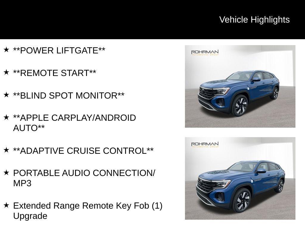 Priced below KBB Fair Purchase Price! 2025 Volkswagen Atlas Cross Sport 2.0T SE w/Technology Mountain Lake Blue Metallic 2.0L TSI AWD **ALL WHEEL DRIVE**, **LEATHER SEATS**, **PUSH BUTTON START**, **KEYLESS ENTRY**, **BACKUP CAMERA**, **RAIN SENSING WIPERS!**, **BLUETOOTH**, **HEATED STEERING WHEEL**, **POWER LIFTGATE**, **REMOTE START**, **BLIND SPOT MONITOR**, **APPLE CARPLAY/ANDROID AUTO**, **ADAPTIVE CRUISE CONTROL**, PORTABLE AUDIO CONNECTION/MP3, Extended Range Remote Key Fob (1) Upgrade, Heavy Duty Trunk Liner w/VW CarGo Blocks, Monster Mats Rubber Mats (Set of 4), Rubber Mats Kit, Volkswagen Logo Puddle Lights (Set of 2), VW Care. With options like Extended Range Remote Key Fob (1) Upgrade, Heavy Duty Trunk Liner w/VW CarGo Blocks, Monster Mats Rubber Mats (Set of 4), Rubber Mats Kit, Volkswagen Logo Puddle Lights (Set of 2), VW Care, 4-Wheel Disc Brakes, 4-Wheel Independent Suspension, 6 Speakers, ABS brakes, Air Conditioning, Alloy wheels, AM/FM radio: SiriusXM with 360L, Auto High-beam Headlights, Auto-dimming Rear-View mirror, Automatic temperature control, Brake assist, Bumpers: body-color, Compass, Delay-off headlights, Driver door bin, Driver vanity mirror, Dual front impact airbags, Dual front side impact airbags, Electronic Stability Control, Emergency communication system: VW Car-Net Safe & Secure 5-year, Exterior Parking Camera Rear, Four wheel independent suspension, Front anti-roll bar, Front Bucket Seats, Front Center Armrest, Front dual zone A/C, Front fog lights, Front reading lights, Fully automatic headlights, Heated & Actively Ventilated Front Seats, Heated door mirrors, Heated front seats, Heated steering wheel, Illuminated entry, Low tire pressure warning, Occupant sensing airbag, Outside temperature display, Overhead airbag, Overhead console, Panic alarm, Passenger door bin, Passenger vanity mirror, Perforated V-Tex Leatherette Seating Surfaces, Power door mirrors, Power driver seat, Power Liftgate, Power steering, Power windows, Radio data system, Radio: MIB3 Composition Media AM/FM/HD, Rain sensing wipers, Rear anti-roll bar, Rear reading lights, Rear seat center armrest, Rear window defroster, Rear window wiper, Remote keyless entry, Security system, Speed control, Speed-sensing steering, Split folding rear seat, Spoiler, Steering wheel mounted audio controls, Tachometer, Telescoping steering wheel, Tilt steering wheel, Traction control, Trip computer, Turn signal indicator mirrors, Variably intermittent wipers, Ventilated front seats, and Wheels: 20 5-Spoke 2-Tone Machined Alloy. **All prices do not include tax, title, license and Illinois documentation fee. All offers with approved credit. Sale pricing includes all Volkswagen rebates and incentives applicable to everyone. Additional Dealer Exclusive savings may be available. See dealer for details. **Dealer installed items may not be updated in price, please check with dealer for details. All prices, specifications and availability are subject to change witho