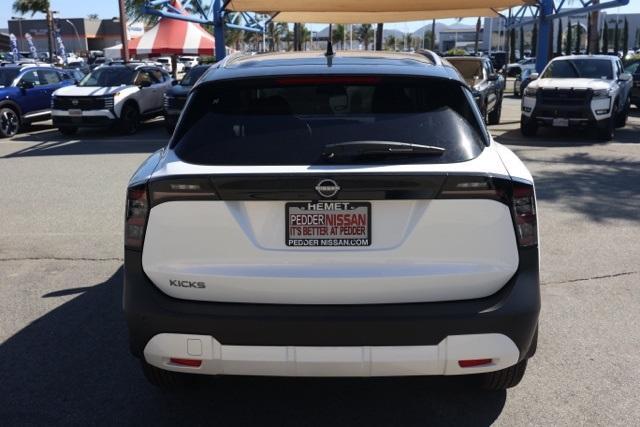 This 2026 Aspen White Tricoat/Super Black Nissan Kicks SV FWD is well equipped and includes these features and benefits: 2-Tone Premium Paint, 4 Speakers, 4-Wheel Disc Brakes, ABS brakes, Air Conditioning, AM/FM radio, Auto High-beam Headlights, Automatic temperature control, Blind Spot Warning, Brake assist, Bumpers: body-color, Carpeted Floor Mats & Underfloor Protector, Cloth Seat Trim, Driver door bin, Driver vanity mirror, Dual front impact airbags, Dual front side impact airbags, Electronic Stability Control, Emergency communication system, Exterior Parking Camera Rear, Front anti-roll bar, Front Bucket Seats, Front Center Armrest, Front reading lights, Front wheel independent suspension, Fully automatic headlights, Illuminated entry, Knee airbag, Low tire pressure warning, NissanConnect featuring Apple CarPlay and Android Auto, Occupant sensing airbag, Outside temperature display, Overhead airbag, Panic alarm, Passenger door bin, Passenger vanity mirror, Power door mirrors, Power steering, Power windows, Radio data system, Radio: AM/FM/SiriusXM Audio System, Rear anti-roll bar, Rear reading lights, Rear side impact airbag, Rear window defroster, Rear window wiper, Remote keyless entry, Security system, Speed control, Speed-sensing steering, Splash Guards, Split folding rear seat, Spoiler, Sport steering wheel, Steering wheel mounted audio controls, Tachometer, Telescoping steering wheel, Tilt steering wheel, Traction control, Trip computer, Variably intermittent wipers, and Wheels: 17 Steel Flex w/Full Covers Plus 3 Month 3000 Mile Warranty. See Dealer For Details. Apple Car Play/Android Auto, Automatic Climate Control, Backup Camera. 28/35 City/Highway MPG ⢠MSRP is the Manufacturer's Suggested Retail Price, which is not necessarily the sale price and is not the advertised price. For specific pricing information, please contact Pedder Nissan at (951) 766-1446. Price does include: ⢠The Advertised Price for any/all vehicles offered for sale does not include dealer installed accessories. These accessories can be purchased for an additional cost. Price does include: ⢠All vehicles subject to prior sale. All prices plus government fees and taxes, any finance charges, any dealer document processing charges ($85), any electronic filing charge, and any emission testing charge. Offers and prices not available to other dealers, wholesalers, or brokers. For out of state purchase customers, customers must be present to purchase. If shipping is required, dealership must facilitate; no exceptions. Special financing in lieu of any rebates. This price may not be combined with any other offer. Price does include: ⢠All information is believed to be accurate but is not guaranteed. For accurate pricing, mileage, availability, options, etc, please contact Pedder Nissan at (951) 766-1446. The sales price includes factory rebates and trade in incentives on this vehicle that are valid on a cash or financed purchase only by an individual for their pe