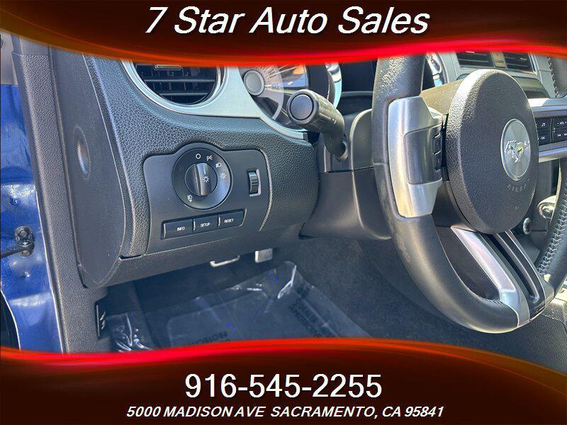 Behold the 2012 Ford Mustang V6 Premium, a beast on wheels that's as fun to drive as it is to look at! This bad boy is powered by a 3.7L V6 engine that pumps out 305 horsepower that's enough oomph to make your daily commute feel like a victory lap at the racetrack. Step inside and sink into the lap of luxury with the black leather interior that wraps you in comfort and style. The exterior is a show-stopping Kona Blue Metallic that's sure to turn heads wherever you go just try not to get too distracted by your own reflection as you cruise by. But wait, there's more! This Mustang is not just a pretty face; it's also a fuel-sipping champ, with an impressive 19 MPG in the city and 29 MPG on the highway. So go ahead, take the scenic route your wallet will thank you later. And if all that wasn't enough to rev your engine, this baby comes with a clean CARFAX report, so you can rest easy knowing you're getting a top-notch ride. Don't miss out on this opportunity to own a piece of automotive history in excellent overall condition because life's too short to drive a boring car! 7 Star Auto Sales 5000 Madison Ave SACRAMENTO, CA 95841 (916) 545-2255 7 Star Auto Sales is a used car dealership located in Sacramento, CA, known for offering a wide selection of quality pre-owned vehicles. The dealership is focused on providing a transparent, fair, and hassle-free car-buying experience for its customers. In addition to sales, the dealership offers financing options and consignment services. -- INSTALLED FEATURES: Front air conditioning, Front air conditioning zones: single, Airbag deactivation: occupant sensing passenger, Front airbags: dual, Side airbags: front / head protection chambers, Antenna type: mast, Auxiliary audio input: jack, In-Dash CD: single disc, Radio: AM/FM, Satellite radio: SiriusXM, Total speakers: 8, Watts: 500, Front brake type: ventilated disc, Power brakes, Rear brake type: ventilated disc, Dash trim: alloy, Door sill trim: scuff plate, Floor mat material: rubber/vinyl, Floor mats: front, Foot pedal trim: aluminum, Interior accents: aluminum, Shift knob trim: alloy, Steering wheel trim: alloy / leather, Ambient lighting, Capless fuel filler system, Center console: front console with armrest and storage, Cruise control, Cupholders: covered / front, Footwell lights, Multi-function remote: keyless entry / trunk release, One-touch windows: 2, Power outlet(s): two 12V, Power steering: variable/speed-proportional, Rearview mirror: auto-dimming, Steering wheel: tilt, Steering wheel mounted controls: cruise control, Storage: front seatback, Universal remote transmitter: Homelink - garage door opener, Vanity mirrors: dual illuminating, Exhaust: dual tip, Exhaust tip color: stainless steel, Mirror color: black, Infotainment: SYNC, Clock, Multi-function display, Warnings and reminders: coolant temperature warning / lamp failure / low fuel level / low oil pressure, Headlights: halogen, Taillights: LED, Side mirror adjustments: power, Limited slip differential: rear, Child seat anchors: LATCH system, Impact sensor: post-collision safety system, Programmable safety key, Front seatbelts: 3-point, Rear seatbelts: 3-point, Seatbelt pretensioners: front, Driver seat power adjustments: 6 / lumbar, Front headrests: 2 / adjustable, Front seat type: bucket, Passenger seat manual adjustments: 2, Rear headrests: 2 / adjustable, Rear seat folding: split, Rear seat type: 50-50 split bench, Upholstery: leather, Anti-theft system: alarm / vehicle immobilizer, Power door locks, Stability control, Traction control, Front shock type: gas, Front spring type: coil, Front stabilizer bar: diameter 33 mm, Front struts: MacPherson, Front suspension classification: independent, Front suspension type: lower control arms, Rear shock type: gas, Rear spring type: coil, Rear stabilizer bar: diameter 22 mm, Rear suspension classification: solid live axle, Rear suspension type: multi-link, Tire Pressure Monitoring System, Wheel spokes: 5, Wheels: alumi