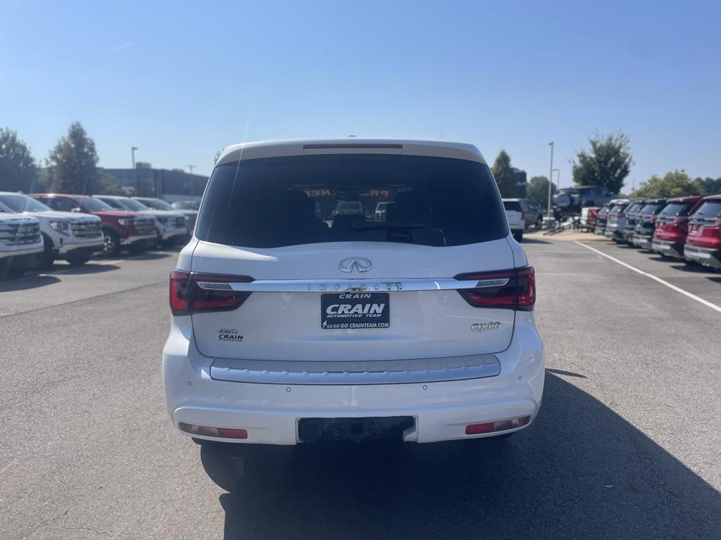 QX80 Sensory, 4D Sport Utility, 5.6L V8, 7-Speed Automatic, 4WD, Moonstone White, Saddle Brown w/Semi-Aniline Leather-Appointed Seats, 17 Speakers, 2.937 Axle Ratio, 3rd row seats: split-bench, 4-Wheel Disc Brakes, ABS brakes, All-Season Floor Mats, All-Season Package, AM/FM radio: SiriusXM, Anti-whiplash front head restraints, Auto High-beam Headlights, Auto tilt-away steering wheel, Auto-dimming door mirrors, Auto-dimming Rear-View mirror, Auto-leveling suspension, Automatic temperature control, Brake assist, Bumpers: body-color, Cargo Package, Cargo Protector, Climate Controlled Front Bucket Seats, Compass, Console Net, Delay-off headlights, Driver door bin, Driver vanity mirror, Electronic Stability Control, Emergency communication system: INFINITI InTouch w/1-year trial, First-Aid Kit, Four wheel independent suspension, Front anti-roll bar, Front Bucket Seats, Front Center Armrest, Front dual zone A/C, Front fog lights, Front reading lights, Fully automatic headlights, Garage door transmitter: HomeLink, Heated door mirrors, Heated front seats, Heated rear seats, Heated steering wheel, High-Density Non-Slip Rear Cargo Carpet, Illuminated entry, INFINITI Radiant Illuminated Cargo Scuff Plates, INFINITI Radiant Illuminated Kick Plates, Leather Shift Knob, Leather steering wheel, Literature Kit, Low tire pressure warning, Memory seat, Navigation system: INFINITI InTouch Navigation, Nylon-Cord Cargo Net, Outside temperature display, Overhead console, Panic alarm, Passenger door bin, Passenger vanity mirror, Power door mirrors, Power driver seat, Power Liftgate, Power moonroof, Power passenger seat, Power windows, Premium audio system: Bose, Radio data system, Radio: Bose Performance Audio System w/17 Speakers, Rain sensing wipers, Rear air conditioning, Rear reading lights, Rear seat center armrest, Rear window defroster, Rear window wiper, Rear-Seat Entertainment, Reclining 3rd row seat, Remote keyless entry, Roof Rail Cross Bars, Security system, Semi-Aniline Leather-Appointed Seats, Speed control, Speed-sensing steering, Split folding rear seat, Spoiler, Steering wheel memory, Steering wheel mounted audio controls, Tachometer, Telescoping steering wheel, Tilt steering wheel, Trip computer, Turn signal indicator mirrors, Variably intermittent wipers, Ventilated front seats, Voltmeter, Wheels: 22'' x 8.0'' Dark Cast Chrome Aluminum-Alloy.Clean CARFAX. CARFAX One-Owner.*Welcome to the Crain Family!*Ask about Our Crain Commitment! *Pressure Free, Efficient, Friendly, and Helpful Sales Staff! *In House Team of Loan and Lease Specialists! Good with numbers, and even better with people! Credit Challenged? Give us a try! * Free Car Washes with any Service! * Massive Inventory for One Stop Shopping! * Certified Factory Service Technicians! **INTERNET PRICE DISCLOSURE: *As we try to keep our website and prices as updated as possible, please understand that sometimes there can be delays in the updating of the shown Internet Price. * The shown Internet Price may or may not include the cost of any Reconditioning Cost depending on when Accounting closes the Repair Order.
