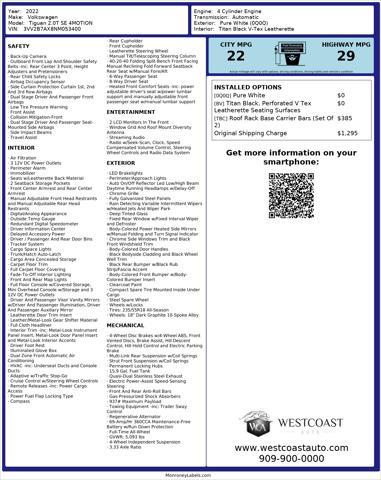 Stylish and versatile, our 2022 Volkswagen Tiguan SE 4MOTION gets your driving off to a great start in Pure White! Powered by a TurboCharged 2.0 Liter 4 Cylinder delivering 184hp connected to an 8 Speed Tiptronic Automatic transmission. With that on board, our All Wheel Drive SUV combines bold performance with the ability to see nearly 29mpg on the highway. This Tiguan also takes on your days with dynamic good looks courtesy of LED lighting, silver roof rails, heated power mirrors, a panoramic sunroof, alloy wheels, and even heated windshield-washer nozzles. Our five-place SE cabin is a great fit for you and your friends or family with heated leatherette front seats, flexible second and third rows, a leatherette-wrapped steering wheel, dual-zone automatic climate control, and intelligent infotainment technology you'll appreciate whether you're commuting, camping out, or carrying the kids to school. Highlights include a Digital Cockpit driver display, an 8-inch touchscreen, Android Auto®, Apple CarPlay®, Bluetooth®, WiFi compatibility, wireless charging, and a Composition Media sound system. Volkswagen helps keep you out of harm's way with a backup camera, automatic braking, forward-collision warning, pedestrian detection, a blind-spot monitor, adaptive cruise control, and more. Our Tiguan SE blends the spirit of the tiger and the agility of the iguana! Save this Page and Call for Availability. We Know You Will Enjoy Your Test Drive Towards Ownership! Great quality, easy financing and affordable prices aren't the only things that make Westcoast Auto Sales the first choice of many discerning auto buyers. Stop in and See California's Dealer of the Year!