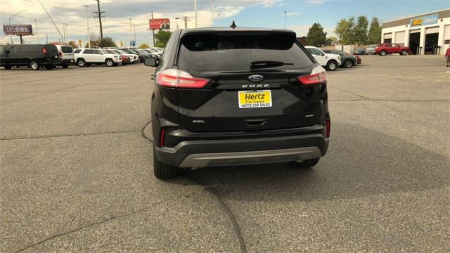 2023 Ford Edge SEL Agate Black Metallic EcoBoost 2.0L I4 GTDi DOHC Turbocharged VCT AWDCARFAX One-Owner. Clean CARFAX.ALL WHEEL DRIVE, BLIND SPOT MONITOR, LANE DEPARTURE SYSTEM, HEATED SEATS, BLUETOOTH, SATELLITE RADIO, POWER DRIVER SEAT, DUAL POWER SEATS, DRIVER INFORMATION CENTER, DUAL CLIMATE CONTROL, ALLOY WHEELS, FOG LIGHTS, KEYLESS ENTRY, PUSH BUTTON START, POWER LIFTGATE, USB PORT, BACKUP SENSORS, BACKUP CAMERA, HOMELINK, REMOTE START, AWD, 110V/150W AC Power Outlet, Convenience Package, Fog Lamps w/Iconic Silver Bezel, Perimeter Alarm, Power Liftgate, Remote Start System, Universal Garage Door Opener (UGDO), Wireless Charging Pad.Convenience Package (110V/150W AC Power Outlet, Fog Lamps w/Iconic Silver Bezel, Perimeter Alarm, Power Liftgate, Remote Start System, Universal Garage Door Opener (UGDO), and Wireless Charging Pad), Equipment Group 201A, AWD, 3.80 Axle Ratio, 4-Wheel Disc Brakes, 6 Speakers, ABS brakes, ActiveX Seating Material Heated Bucket Seats, Air Conditioning, Alloy wheels, AM/FM radio: SiriusXM with 360L, Auto High-beam Headlights, Auto-dimming Rear-View mirror, Automatic temperature control, Brake assist, Bumpers: body-color, Compass, Delay-off headlights, Driver door bin, Driver vanity mirror, Dual front impact airbags, Dual front side impact airbags, Electronic Stability Control, Emergency communication system: SYNC 4 911 Assist, FordPass Connect, Four wheel independent suspension, Front anti-roll bar, Front Bucket Seats, Front Center Armrest w/Storage, Front dual zone A/C, Front License Plate Bracket, Front reading lights, Fully automatic headlights, Heated door mirrors, Heated front seats, Illuminated entry, Knee airbag, Leather steering wheel, Leather-Wrapped Steering Wheel, Low tire pressure warning, Occupant sensing airbag, Outside temperature display, Overhead airbag, Overhead console, Panic alarm, Passenger door bin, Passenger vanity mirror, Power door mirrors, Power driver seat, Power passenger seat, Power steering, Power windows, Radio: AM/FM Stereo/MP3 Capable, Rear anti-roll bar, Rear Parking Sensors, Rear reading lights, Rear seat center armrest, Rear window defroster, Rear window wiper, Remote keyless entry, SiriusXM w/360L, Speed control, Speed-Sensitive Wipers, Split folding rear seat, Spoiler, Steering wheel mounted audio controls, SYNC 4A w/Enhanced Voice Recognition, Tachometer, Telescoping steering wheel, Tilt steering wheel, Traction control, Trip computer, Variably intermittent wipers, and Wheels: 18'' Sparkle Silver-Painted Aluminum.