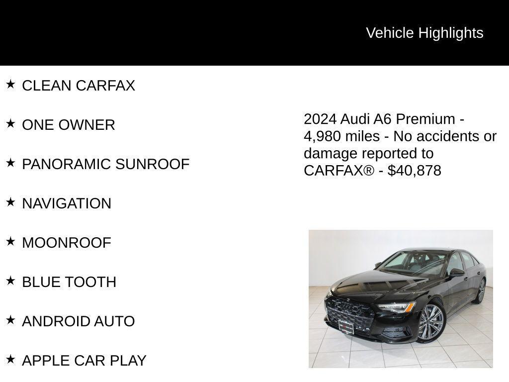 2024 Audi A6 Black CLEAN CARFAX, ONE OWNER, PANORAMIC SUNROOF, NAVIGATION, MOONROOF, BLUE TOOTH, ANDROID AUTO, APPLE CAR PLAY, HARMAN KARDON AUDIO, USB PORT, BLIND SPOT MONITOR, REAR BACK UP CAMERA, LANE MONITOR DETECTOR, PREMIUM SOUND, LEATHER INTERIOR, HEATED SEATS, NON-SMOKER, 2 KEYS, quattro, Black Leather, 10 Speakers, 4-Wheel Disc Brakes, ABS brakes, Air Conditioning, Alloy wheels, AM/FM radio: SiriusXM w/ 360L, Auto High-beam Headlights, Auto tilt-away steering wheel, Auto-dimming door mirrors, Auto-dimming Rear-View mirror, Automatic temperature control, Brake assist, Bumpers: body-color, Compass, Delay-off headlights, Driver door bin, Driver vanity mirror, Dual front impact airbags, Dual front side impact airbags, Electronic Stability Control, Emergency communication system: Audi connect CARE (limited time subscription), Exterior Parking Camera Rear, Four wheel independent suspension, Front anti-roll bar, Front Bucket Seats, Front Center Armrest, Front dual zone A/C, Front fog lights, Front reading lights, Garage door transmitter: HomeLink, Genuine wood console insert, Genuine wood dashboard insert, Genuine wood door panel insert, Heated door mirrors, Heated Front Seats, Heated front seats, Illuminated entry, Knee airbag, Leather Seating Surfaces, Leather Shift Knob, Leather steering wheel, Low tire pressure warning, Memory seat, Navigation system: Audi connect NAV & PLUS, Occupant sensing airbag, Outside temperature display, Overhead airbag, Overhead console, Panic alarm, Passenger door bin, Passenger vanity mirror, Power door mirrors, Power driver seat, Power moonroof, Power passenger seat, Power steering, Power windows, Radio data system, Radio: Audi MMI Nav Plus w/MMI Touch Response, Rain sensing wipers, Rear air conditioning, Rear anti-roll bar, Rear reading lights, Rear seat center armrest, Rear side impact airbag, Rear window defroster, Remote keyless entry, Security system, Speed control, Speed-sensing steering, Speed-Sensitive Wipers, Split folding rear seat, Sport Suspension (-20 mm Ride Height), Steering wheel memory, Steering wheel mounted audio controls, Tachometer, Telescoping steering wheel, Tilt steering wheel, Traction control, Trip computer, Turn signal indicator mirrors, Variably intermittent wipers, Wheels: 19'' 5-Arm Platinum Gray Dynamic Design. As the largest Audi dealership in the Eastern region, we proudly offer the largest selection of both new and pre-owned vehicles in the area. But when you choose to come to Audi Great Neck, you're getting so much more than just a fantastic selection: You're also getting 80-plus years of customer service experience and a low-pressure car-buying experience. We've even been recognized for our outstanding service multiple times, with an Audi Magna Society award, the New York Audi Dealer of the Year title from DealerRater.com, and an International Five Star Diamond Award from the American Academy of Hospitality Sciences. Need another reason to pay us a visit? Here's why you should come to Audi Great Neck. When you come in for your scheduled service appointment, you'll receive a complimentary car wash. We have a drive-in, climate-controlled service drive for your comfort and convenience. We offer a free local shuttle service for service customers who need to go about their busy days. If you choose to wait, our service waiting area is comfortable and spacious, with HDTV, laptop stations, coffee, snacks, refreshments, and free Wi-Fi. We offer a state-of-the-art service facility with factory-trained technicians and support staff who can answer all your questions, and have extended weekday service pickup hours for your convenience.