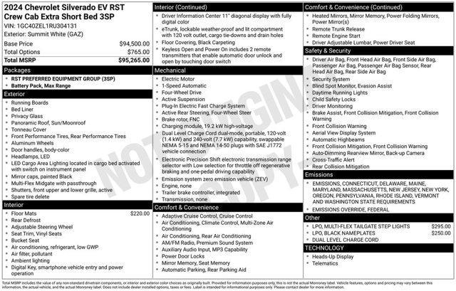 This Chevrolet Silverado EV boasts a Electric engine powering this Automatic transmission. WHEELS, 24 X 9.0 ALUMINUM Carbon Flash Metallic with machined face (STD), TRANSMISSION, NONE (STD), SUMMIT WHITE.* This Chevrolet Silverado EV Features the Following Options *SEATS, FRONT BUCKET (STD), RST PREFERRED EQUIPMENT GROUP includes standard equipment, LPO, MULTI-FLEX TAILGATE STEP LIGHTS (dealer-installed), LPO, BLACK NAMEPLATES (dealer-installed), LPO, ALL-WEATHER FLOOR LINERS (dealer-installed), ENGINE, NONE (STD), DUAL LEVEL CHARGE CORD dual-mode, portable, 120-volt (1.4 kW) and 240-volt (7.7 kW) capability, swappable NEMA 5-15 and NEMA 14-50 plugs with SAE J1772 vehicle connection (STD), BLACK, VINYL SEAT TRIM, Wireless charging, Wipers, front rain-sensing.
