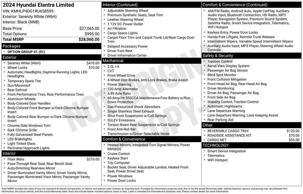 2024 Hyundai Elantra Limited Serenity White FWD CVT 17'' x 7.0J Alloy Wheels, Apple CarPlay & Android Auto, Automatic temperature control, Brake assist, Carpeted Floor Mats, Front dual zone A/C, Heated door mirrors, Heated Front Bucket Seats, Leatherette Seats, Option Group 01, Power door mirrors, Power driver seat, Power moonroof, Rear window defroster, Remote keyless entry, Reversible Cargo Tray, Speed control, Split folding rear seat.Clean CARFAX. 31/40 City/Highway MPGEasterns Automotive Group has 11 locations that has sold thousands of used cars in the Maryland, DC, and Virginia communities for over the past 35 years. Every Easterns vehicle has passed a rigorous Multi-Point Quality Certification, so you can buy with confidence. Start your purchase online to save time by visiting Easterns.com... Any Car, Any Way, For Everyone.