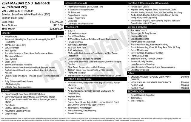 Snowflake White Pearl Mica 2024 Mazda Mazda3 2.5 S Preferred Package SKYACTIV® 2.5L 4-Cylinder DOHC 16V 6-Speed Automatic FWD MAZDA Certified, Remainder Factory Warranty, Sold & Serviced @ 495 Auto Group, ABS brakes, AppLink/Apple CarPlay and Android Auto, Auto High-beam Headlights, Brake assist, Dual front impact airbags, Dual front side impact airbags, Exterior Parking Camera Rear, Front Center Armrest, Heated Front Bucket Seats, Heated front seats, Knee airbag, Leather Shift Knob, Leatherette Seat Trim, MAZDA CONNECT Infotainment System, Occupant sensing airbag, Overhead airbag, Power driver seat, Power moonroof, Rain sensing wipers, Rear side impact airbag, Wheels: 18 x 7J Aluminum Alloy. Mazda Certified Pre-Owned Details: * Limited Warranty: 12 Month/12,000 Mile (whichever comes first) after new car warranty expires or from certified purchase date * Powertrain Limited Warranty: 84 Month/100,000 Mile (whichever comes first) from original in-service date * 160 Point Inspection * Includes Autocheck Vehicle History Report with 3 Year Buyback Protection. 3 month SiriusXM trial subscription. * Transferable Warranty * Roadside Assistance * Warranty Deductible: $0 * Vehicle History As a Family-Owned Dealership, We Pride Ourselves on Treating Every Customer like one of our Own. With Generations of Experience and a deep Commitment to Honesty and Service, We strive to Create a Welcoming, Trustworthy Environment. Our Goal is to Build Lasting Relationships, not just Make a SaleâBecause when you Shop with Us, you're Part of the Family. Please feel free to Call Us to Check On Vehicle Availability or Ask Any Type of Questions on our Inventory or Our Showroom Process. Please View our New or Pre-Owned Inventory @ www.495mazda.com or Call: xxx-xxx-xxxx to Setup Your Showing Appointment at our Dealership.