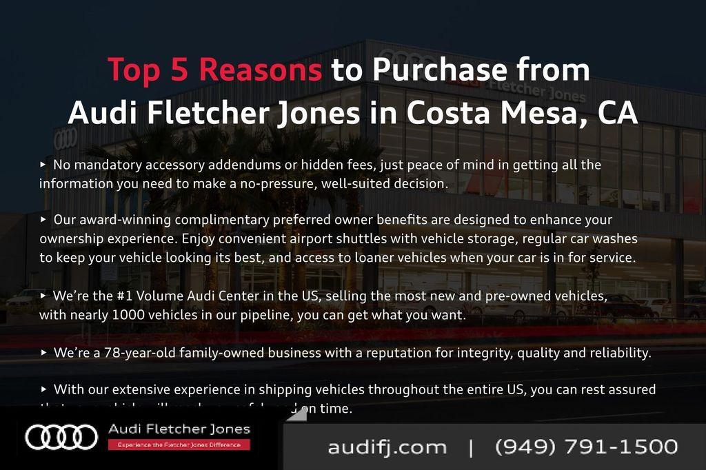 *Audi Fletcher Jones does not reserve, or hold advertised vehicles, all are subject to prior sale on a first come first serve basis. Customer must take delivery of the vehicle and execute all California required documentation at Audi Fletcher Jones. We reserve the right to revise price, equipment, mileage, and certification status as a result of changing market conditions, manufacturer/distributor notices including recall notices, or errors. All vehicle pricing expires upon close of business the same day. The stock images shown are for illustration purposes only and are not an exact representation of the actual vehicle. Audi Fletcher Jones proudly presents this 2025 Audi A6 Sedan. There are many benefits to becoming a Fletcher Jones Owner. Complimentary services include Audi courtesy vehicles for extended repairs, John Wayne Airport pick up and drop off (your vehicle washed and ready upon your return), multi point vehicle inspections and much more. Audi Fletcher Jones is located at 1275 Bristol Street in Costa Mesa, California. Call us at (949) 791-1500 to experience a new level of service. Audi Fletcher Jones, is a proud member of the family owned and operated Fletcher Jones Automotive Group. Weve had the pleasure of serving guests for over 70 years. With an unmatched selection, we offer one of the largest new and pre-owned inventories in the country. We likely have the vehicle youve been searching for, or contact us to help find an exact configuration. Live out of state, but we have the vehicle of your dreams? We offer door-to-door delivery, or can discuss your Orange County vacation options. This Audi includes: FRONT & REAR DOOR AUDI BEAM-RINGS CONVENIENCE PLUS PACKAGE Lane Departure Warning Cooled Front Seat(s) Lane Keeping Assist Heated Steering Wheel Cruise Control Steering Assist Back-Up Camera Aerial View Display System Adaptive Cruise Control Heated Front Seat(s) Passenger Adjustable Lumbar Blind Spot Monitor Premium Sound System Cruise Control Cross-Traffic Alert *Note - For third party subscriptions or services, please contact the dealer for more information.*