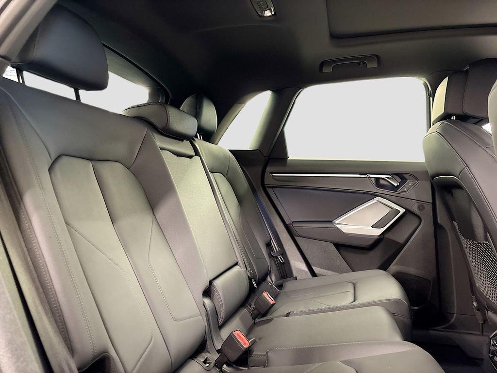 Mythos Black Metallic 2025 Audi Q3 Premium S Line quattro quattro 8-Speed Automatic with Tiptronic 2.0L 4-Cylinder TFSI 20/28 City/Highway MPG Equipped with Convenience Package (DISC) (Alarm w/Motion Sensor, Audi Advanced Key, Auto-Dimming Power-Folding Exterior Mirrors, Auto-Dimming Rear-View Mirror, Driver Seat Memory, Garage Door Opener (HomeLink), SiriusXM w/360L (3 Months Trial), and Wireless Phone Charging Pad), LED Interior Lighting Package, 10 Speakers, 4-Wheel Disc Brakes, ABS brakes, Air Conditioning, Alloy wheels, AM/FM radio, Audi Beam-Rings, Audi Cargo Box, Audi Guard Protection Kit, Audi smartphone interface (Apple CarPlay/Android Auto), Auto High-beam Headlights, Automatic temperature control, Brake assist, Bumpers: body-color, Delay-off headlights, Driver door bin, Driver vanity mirror, Dual front impact airbags, Dual front side impact airbags, Electronic Stability Control, Emergency communication system: Audi connect CARE, Exterior Parking Camera Rear, Four wheel independent suspension, Front anti-roll bar, Front Bucket Seats, Front Center Armrest, Front dual zone A/C, Front fog lights, Front reading lights, Fully automatic headlights, Heated door mirrors, Heated Front Bucket Seats, Heated front seats, Illuminated entry, Knee airbag, Leather Seating Surfaces, Leather Shift Knob, Leather steering wheel, Low tire pressure warning, Occupant sensing airbag, Outside temperature display, Overhead airbag, Overhead console, Panic alarm, Passenger door bin, Passenger vanity mirror, Power door mirrors, Power driver seat, Power Liftgate, Power moonroof: Panoramic, Power passenger seat, Power steering, Power windows, Radio data system, Radio: Audi Sound System, Rain sensing wipers, Rear air conditioning, Rear anti-roll bar, Rear fog lights, Rear reading lights, Rear seat center armrest, Rear window defroster, Rear window wiper, Remote keyless entry, Speed control, Speed-sensing steering, Split folding rear seat, Spoiler, Steering wheel mounted audio controls, Tachometer, Telescoping steering wheel, Tilt steering wheel, Traction control, Trip computer, Turn signal indicator mirrors, Variably intermittent wipers, and Wheels: 18 5-V-Spoke-S Design.
