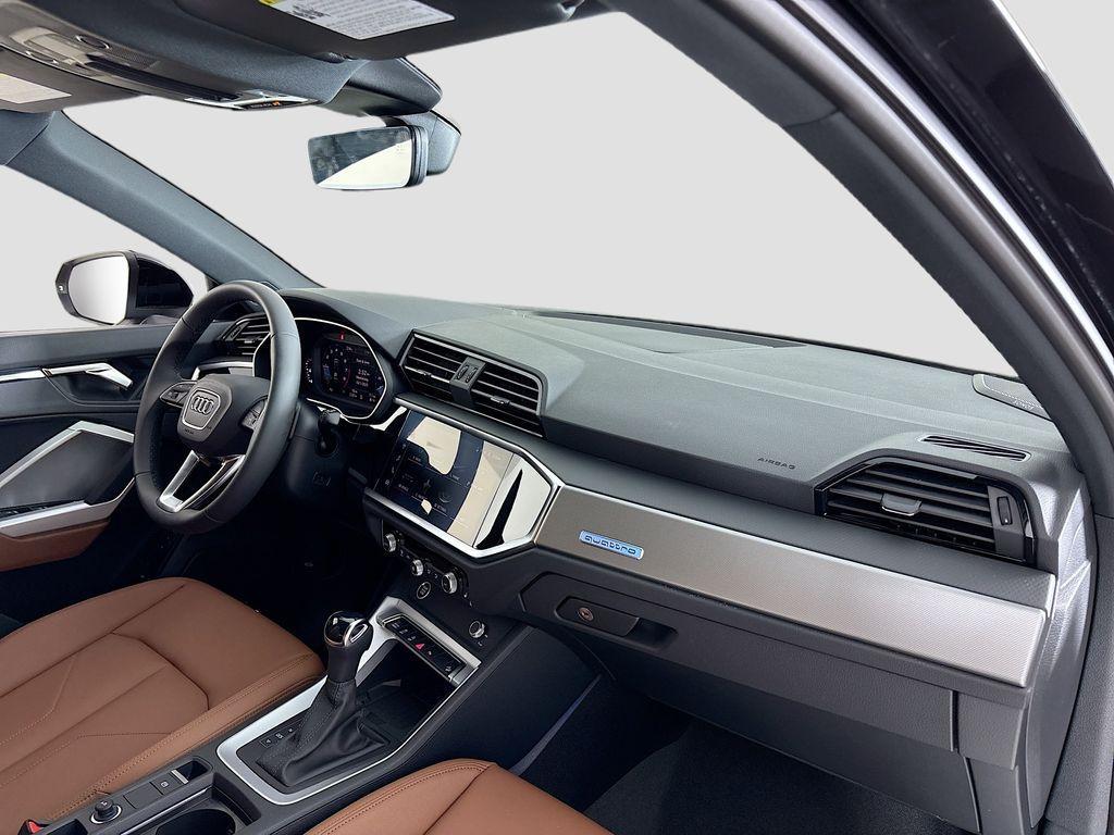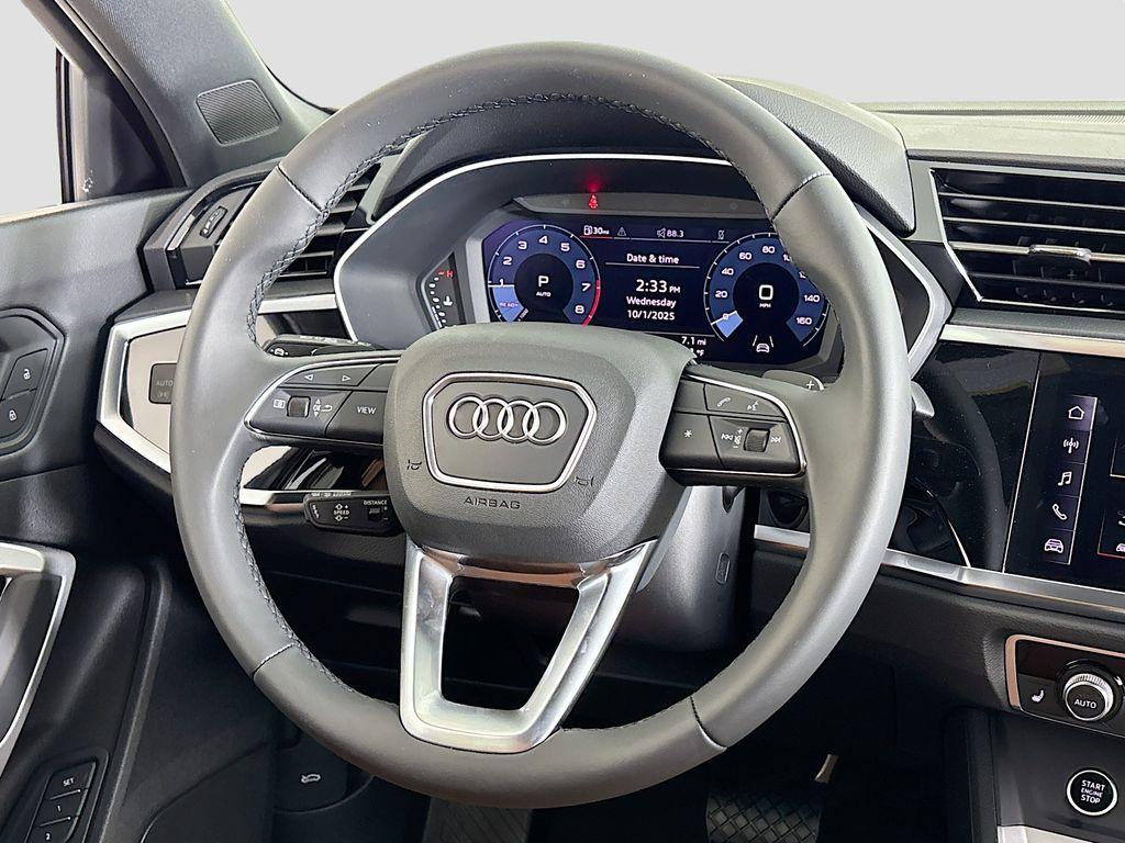 Mythos Black Metallic 2025 Audi Q3 Premium Plus S Line quattro quattro 8-Speed Automatic with Tiptronic 2.0L 4-Cylinder TFSI 20/28 City/Highway MPG Equipped with Convenience Package (DISC) (Alarm w/Motion Sensor, Audi Advanced Key, Auto-Dimming Power-Folding Exterior Mirrors, Auto-Dimming Rear-View Mirror, Driver Seat Memory, Garage Door Opener (HomeLink), SiriusXM w/360L (3 Months Trial), and Wireless Phone Charging Pad), LED Interior Lighting Package, LED Interior Lighting Plus Package, Premium Plus Package (SONOS Premium Sound System w/3D Sound and Top View Camera System), 10 Speakers, 4-Wheel Disc Brakes, ABS brakes, Air Conditioning, Alloy wheels, AM/FM radio, Audi Beam-Rings, Audi Cargo Box, Audi Guard Protection Kit, Audi smartphone interface (Apple CarPlay/Android Auto), Auto High-beam Headlights, Automatic temperature control, Brake assist, Bumpers: body-color, Delay-off headlights, Driver door bin, Driver vanity mirror, Dual front impact airbags, Dual front side impact airbags, Electronic Stability Control, Emergency communication system: Audi connect CARE, Exterior Parking Camera Rear, Four wheel independent suspension, Front anti-roll bar, Front Bucket Seats, Front Center Armrest, Front dual zone A/C, Front fog lights, Front reading lights, Fully automatic headlights, Heated door mirrors, Heated Front Bucket Seats, Heated front seats, Illuminated entry, Knee airbag, Leather Seating Surfaces, Leather Shift Knob, Leather steering wheel, Low tire pressure warning, Occupant sensing airbag, Outside temperature display, Overhead airbag, Overhead console, Panic alarm, Passenger door bin, Passenger vanity mirror, Power door mirrors, Power driver seat, Power Liftgate, Power moonroof: Panoramic, Power passenger seat, Power steering, Power windows, Radio data system, Radio: Audi Sound System, Rain sensing wipers, Rear air conditioning, Rear anti-roll bar, Rear fog lights, Rear reading lights, Rear seat center armrest, Rear window defroster, Rear window wiper, Remote keyless entry, Speed control, Speed-sensing steering, Split folding rear seat, Spoiler, Steering wheel mounted audio controls, Tachometer, Telescoping steering wheel, Tilt steering wheel, Traction control, Trip computer, Turn signal indicator mirrors, Variably intermittent wipers, and Wheels: 18 5-V-Spoke-S Design.