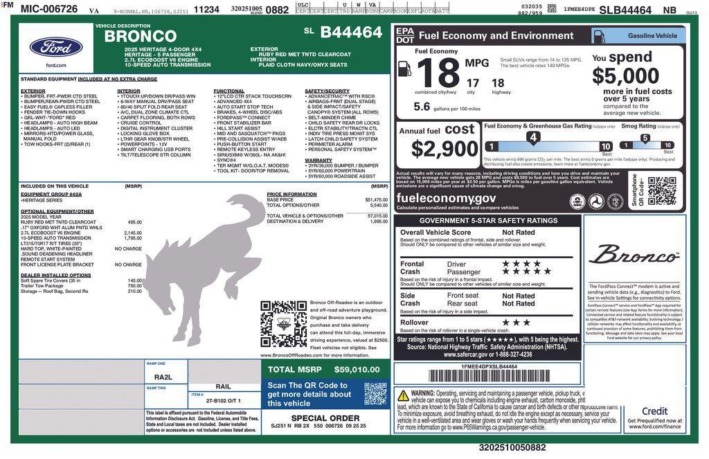 Equipment Group 662A Mid Package, 4-Wheel Disc Brakes, 7 Speakers, ABS brakes, Air Conditioning, Alloy wheels, AM/FM radio: SiriusXM with 360L, AM/FM Stereo, Auto High-beam Headlights, Auto-dimming Rear-View mirror, Automatic temperature control, Brake assist, Compass, Connected Navigation, Convertible HardTop, Convertible roof lining, Delay-off headlights, Driver door bin, Driver vanity mirror, Dual front impact airbags, Dual front side impact airbags, Electronic Stability Control, Emergency communication system: 911 Assist, Exterior Parking Camera Rear, Front anti-roll bar, Front Bucket Seats, Front Center Armrest, Front dual zone A/C, Front fog lights, Front License Plate Bracket, Front reading lights, Front wheel independent suspension, Fully automatic headlights, Glass rear window, Heated door mirrors, Heated front seats, Heated steering wheel, Illuminated entry, Integrated roll-over protection, Leather Shift Knob, Low tire pressure warning, Navigation system: Connected Navigation, Occupant sensing airbag, Outside temperature display, Overhead airbag, Overhead console, Panic alarm, Passenger door bin, Passenger vanity mirror, Plaid Cloth Front Heated Bucket Seats, Power door mirrors, Power steering, Power windows, Radio data system, Rear window defroster, Rear window wiper, Remote keyless entry, Security system, SiriusXM w/360L, Speed control, Split folding rear seat, Steering wheel mounted audio controls, SYNC 4, Tachometer, Telescoping steering wheel, Tilt steering wheel, Traction control, Trip computer, Variably intermittent wipers, and Wheels: 17 Unique White. Price includes: $2000 - Retail Bonus Cash. Exp. 01/05/2026