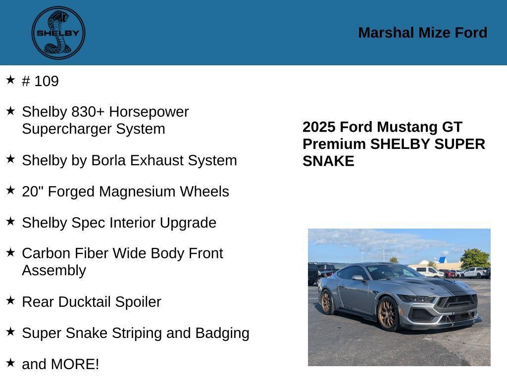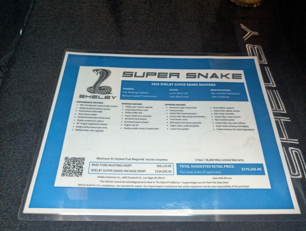 We'll beat your best deal reeee-gardless!!! # 109, Shelby 830+ Horsepower Supercharger System, Shelby by Borla Exhaust System, 20 Forged Magnesium Wheels, Shelby Spec Interior Upgrade, Carbon Fiber Wide Body Front Assembly, Rear Ducktail Spoiler, Super Snake Striping and Badging, and MORE!. 2025 Ford Mustang Iconic Silver Metallic Price includes: $3500 - Retail Customer Cash. Exp. 01/05/2026 $500 - 2025 Military Recognition Exclusive Cash Reward. Exp. 01/05/2026
