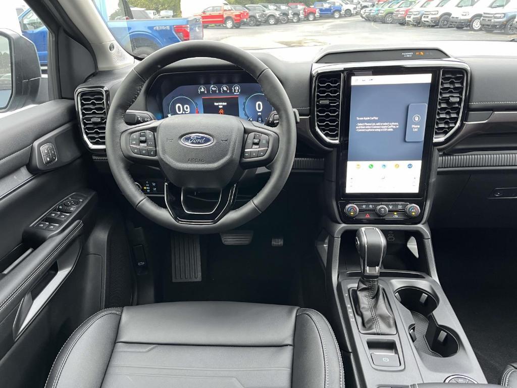 Blue / Gray 2025 Ford Ranger Lariat 4WD 10-Speed Automatic EcoBoost 2.3L I4 GTDi DOHC Turbocharged VCT 4WD. Sport Appearance Package (Gray Painted Center Bar & Grille Surround, Gray Painted Front Fascia & Rear Bumper, and Sport Box Decal), 4WD, 10 Speakers, 3.73 Axle Ratio, 4-Wheel Disc Brakes, ABS brakes, Air Conditioning, Alloy wheels, AM/FM radio: SiriusXM, Auto High-beam Headlights, Auto-dimming Rear-View mirror, Automatic temperature control, Brake assist, Compass, Delay-off headlights, Driver door bin, Driver vanity mirror, Dual front impact airbags, Dual front side impact airbags, Electronic Stability Control, Emergency communication system: SYNC 4 911 Assist, Front anti-roll bar, Front Bucket Seats, Front Center Armrest, Front dual zone A/C, Front fog lights, Front reading lights, Front wheel independent suspension, Fully automatic headlights, Garage door transmitter, Heated door mirrors, Heated front seats, Heated steering wheel, Illuminated entry, Leather Shift Knob, Leather steering wheel, Leather-Trimmed Front Heated Bucket Seats, Low tire pressure warning, Memory seat, Navigation system: Connected Navigation, Occupant sensing airbag, Outside temperature display, Overhead airbag, Overhead console, Panic alarm, Passenger door bin, Passenger vanity mirror, Power door mirrors, Power driver seat, Power passenger seat, Power steering, Power windows, Radio: B&O Sound System by Bang & Olufsen, Rain sensing wipers, Rear reading lights, Rear seat center armrest, Rear step bumper, Rear window defroster, Remote keyless entry, Security system, SiriusXM Satellite Radio, Speed control, Speed-sensing steering, Steering wheel mounted audio controls, SYNC 4A w/Connected Navigation, Telescoping steering wheel, Tilt steering wheel, Traction control, Trip computer, Turn signal indicator mirrors, Variably intermittent wipers, Voltmeter, and Wheels: 18' Machined Aluminum w/Dark Pockets.