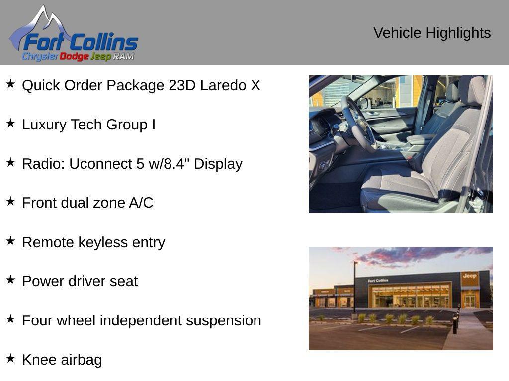 Diamond Black Crystal Pearlcoat 2025 Jeep Grand Cherokee Laredo 4WD 8-Speed Automatic 3.6L V6 24V VVT 115V Auxiliary Power Outlet, Active Cruise Control, Cloth Seats, Dual front impact airbags, Dual front side impact airbags, Four wheel independent suspension, Front dual zone A/C, Heated Front Seats, Heated Steering Wheel, Knee airbag, Laredo X, Luxury Tech Group I, Overhead airbag, ParkView Rear Back-Up Camera, Power driver seat, Power Liftgate, Power Sunroof, Quick Order Package 23D Laredo X, Radio: Uconnect 5 w/8.4'' Display, Remote keyless entry, Remote Start System, Wheels: 18'' x 8'' Fully Painted Aluminum, Wireless Charging Pad.Our dealership is proud to serve not only Fort Collins but all of northern Colorado including Wyoming. With quality new and used cars and trucks. With the latest models of Jeep, Ram, Dodge, Chrysler. Come over and visit us at our Dodge Chrysler Ram location 3835 South College Avenue or our Jeep location 224 W Harmony Rd in Fort Collins and test drive a new Jeep, Ram, Dodge, or Chrysler or an used car or truck. We do our best to make sure our customers leave our dealership 100% satisfied with our excellent customer service and our friendly salespeople. We offer fantastic leases and financing options. Come test drive one of our new Hybrid vehicles or one of our heavy duty Rams! Call us to schedule today at 970.226.5340.Recent Arrival! 19/26 City/Highway MPG Price includes: $2000 - 2025 National Holiday Select Inventory Bonus Cash. Exp. 12/01/2025 $2250 - 2025 National Retail Bonus Cash . Exp. 12/01/2025