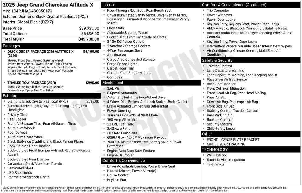 Price includes: $1750 - 2025 National Retail Bonus Cash . Exp. 11/03/2025 $500 - 2025 National Jeep Monopoly Money Bonus Cash . Exp. 11/03/2025 2025 Jeep Grand Cherokee Altitude X WE SHIP NATIONWIDE!!!!.