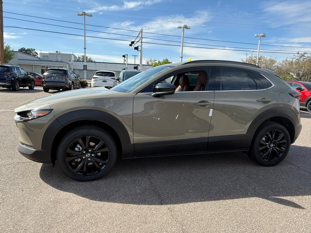 This NEW 2025 Sand Metallic Mazda CX-30 2.5 Carbon Turbo 2.5L I4 6-Speed Automatic AWD is well equipped and includes these features and benefits: 4-Wheel Disc Brakes, 8 Speakers, ABS brakes, Air Conditioning, Alloy wheels, AM/FM radio, AppLink/Apple CarPlay and Android Auto, Auto High-beam Headlights, Automatic temperature control, Brake assist, Bumpers: body-color, Cargo Cover, Cargo Tray, Compass, Delay-off headlights, Driver door bin, Driver vanity mirror, Dual front impact airbags, Dual front side impact airbags, Electronic Stability Control, Emergency communication system: Mazda Connected Services (3-year trial subscription included), Exterior Parking Camera Rear, Front anti-roll bar, Front Bucket Seats, Front Center Armrest, Front dual zone A/C, Front reading lights, Front wheel independent suspension, Fully automatic headlights, Heated door mirrors, Heated Front Bucket Seats, Heated front seats, High Wall All-Weather Floor Mats, Illuminated entry, Knee airbag, Leather Shift Knob, Leather steering wheel, Leatherette Seat Trim, Low tire pressure warning, MAZDA CONNECT Infotainment System, Memory seat, Occupant sensing airbag, Outside temperature display, Overhead airbag, Overhead console, Panic alarm, Passenger door bin, Passenger vanity mirror, Power door mirrors, Power driver seat, Power moonroof, Power steering, Power windows, Radio data system, Radio: AM/FM/HD Audio System, Rain sensing wipers, Rear seat center armrest, Rear side impact airbag, Rear window defroster, Rear window wiper, Remote keyless entry, Speed control, Speed-sensing steering, Split folding rear seat, Spoiler, Stainless Steel Rear Bumper Guard, Steering wheel mounted audio controls, Tachometer, Telescoping steering wheel, Tilt steering wheel, Traction control, Trip computer, Turn signal indicator mirrors, Variably intermittent wipers, Wheels: 18 x 7J Aluminum Alloy. 22/30 City/Highway MPG Quality Mazda is your trusted Mazda dealership in Albuquerque and the reason why our loyal customers keep coming back. From the time you enter our showroom when you service with us, you can expect to be treated like family, each and every visit. We offer an extensive new and pre-owned inventory, as well as our competitive lease specials, finance options and expert auto service. We are dedicated to providing exceptional customer service and being an integral part of our community. We look forward to seeing you soon!