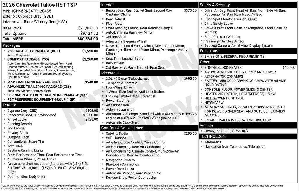 Cypress Gray 2026 Chevrolet Tahoe RST 4WD, Red Leather.Factory MSRP: $82,904Advanced Trailering Package (Blind Zone Steering Assist w/Trailering, Hitch View w/Pan/Zoom Image Adjustment, and Smart Trailer Integration Indicator), Comfort Package (2nd Row Pwr Release 60/40 Split-Folding Bench Seat, 3rd Row 60/40 Power-Folding Split-Bench Seat, Bose 10-Speaker Centerpoint Surround Audio Sys Ft, Heated 2nd Row Outboard Seats, Heated Steering Wheel, LED Headlamps w/LED Daytime Running Lamps, LED Tail Lamps, Memory Settings, and Outside Heated Power-Adjustable Mirrors), License Plate Front Mounting Package, Max Trailering Package (2-Speed Active Electronic AutoTrac Transfer Case, Hill Descent Control, and Integrated Trailer Brake Controller), Preferred Equipment Group 1SP (1st & 2nd Row Color-Keyed Carpeted Floor Mats, 3-Spoke Wrapped Steering Wheel, 3rd Row Manual 60/40 Split-Folding Bench Seats, Auto-Dimming Inside Rear-View Mirror, Bright Front & Rear Door Sill Plates, Color-Keyed Carpeting Floor Covering, Dual Exhaust System, Floor Console w/Storage Area, Front LED Fog Lamps, Frontal Driver & Outboard Passenger Airbags, Interior Camera, Key Card, Memory Settings for Driver, Rear Power Liftgate, Remote Start, RST Exterior Features, SiriusXM w/360L Trial Subscription, Universal Home Remote, USB Ports, and Wireless Phone Charging), RST Capability Package (Air Ride Adaptive Suspension, Floor Console, and Magnetic Ride Control Suspension), 4WD, Red Leather, 1.5 kW Heater/Defrost Air System, 2-Way Power Driver Lumbar Seat Adjuster, 2-Way Power Front Passenger Lumbar Seat Adjuster, 250-Amp Alternator, 3 Years SiriusXM, 3.23 Rear Axle Ratio, 3rd row seats: split-bench, 4-Wheel Disc Brakes, 6 Speakers, 6-Speaker Audio System Feature, 8-Way Power Driver Seat Adjuster, 8-Way Power Front Passenger Seat Adjuster, 850 Cold-Cranking Amps Battery, ABS brakes, Air Conditioning, Alloy wheels, AM/FM radio: SiriusXM with 360L, Apple CarPlay/Android Auto, Auto High-beam Headlights, Auto-dimming Rear-View mirror, Automatic temperature control, Brake assist, Bumpers: body-color, Compass, Delay-off headlights, Diesel B20 Fuel, Driver door bin, Driver vanity mirror, Dual front impact airbags, Dual front side impact airbags, Dual-Pane Power Panoramic Sunroof, Electronic Stability Control, Emergency communication system: OnStar and Chevrolet connected services capable, Engine Block Heater, Exterior Parking Camera Rear, Four wheel independent suspension, Front anti-roll bar, Front Bucket Seats, Front Center Armrest, Front dual zone A/C, Front fog lights, Front reading lights, Fully automatic headlights, Garage door transmitter, Heated door mirrors, Heated Driver & Front Passenger Seats, Heated front seats, Illuminated entry, Low tire pressure warning, Memory seat, Navigation system: Google built-in compatibility (select service plan required, terms and limitations apply), Occupant sensing airbag, Outside temperature display, Overhead airbag, Overhead console, Panic alarm, Passenger door bin, Passenger vanity mirror, Perforated Leather Seat Trim, Power door mirrors, Power driver seat, Power Liftgate, Power passenger seat, Power Release 2nd Row Bucket Seats, Power steering, Power windows, Premium audio system: Chevrolet Infotainment 3 Premium, Premium Smooth Ride Suspension, Radio data system, Radio: 17.7'' Diagonal Advanced Color LCD Display, Rain sensing wipers, Rear air conditioning, Rear anti-roll bar, Rear reading lights, Rear seat center armrest, Rear window defroster, Rear window wiper, Remote keyless entry, Security system, Set of 4 Wheel Locks (LPO), Speed control, Speed-sensing steering, Split folding rear seat, Spoiler, Steering wheel mounted audio controls, Tachometer, Telescoping steering wheel, Tilt steering wheel, Traction control, Trip computer, Upper & Lower Active Aero Shutters, Variably intermittent wipers, Voltmeter, and Wheels: 22'' x 9'' Bright Machined. Buyer is responsible for Tax, Title, License and Doc Fee of $367.70. All adver