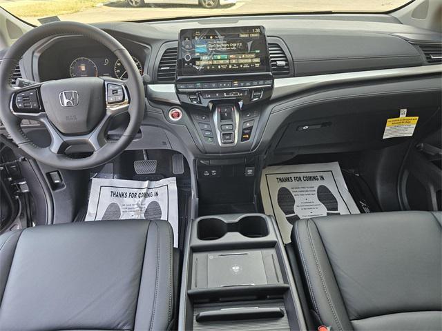 Modern Steel Metallic 2026 Honda Odyssey EX-L 18'' Machine-Finished Alloy Wheels, 3rd row seats: split-bench, 4-Wheel Disc Brakes, 7 Speakers, ABS brakes, Adaptive Cruise Control: Adaptive Cruise Control (ACC) with Low-Speed Follow, Air Conditioning, Alloy wheels, AM/FM radio: SiriusXM, Anti-whiplash front head restraints, Apple CarPlay/Android Auto, Auto High-beam Headlights, Auto-dimming Rear-View mirror, Automatic temperature control, Blind Spot Information (BSI) System warning, Brake assist, Bumpers: body-color, Delay-off headlights, Driver door bin, Driver vanity mirror, Driver's Seat Mounted Armrest, Dual front impact airbags, Dual front side impact airbags, Electronic Stability Control, Exterior Parking Camera Rear, Four wheel independent suspension, Front anti-roll bar, Front Bucket Seats, Front dual zone A/C, Front fog lights, Front reading lights, Fully automatic headlights, Garage door transmitter: HomeLink, Heated door mirrors, Heated Front Bucket Seats, Heated front seats, Illuminated entry, Knee airbag, Lane departure: Lane Keeping Assist System (LKAS) active, Leather steering wheel, Leather-Trimmed Seats, Low tire pressure warning, Memory seat, Occupant sensing airbag, Outside temperature display, Overhead airbag, Overhead console, Panic alarm, Passenger door bin, Passenger seat mounted armrest, Passenger vanity mirror, Power door mirrors, Power driver seat, Power Liftgate, Power moonroof, Power passenger seat, Power steering, Power windows, Radio data system, Radio: 160-Watt AM/FM/HD/SiriusXM Audio System, Rear air conditioning, Rear anti-roll bar, Rear reading lights, Rear seat center armrest, Rear window defroster, Rear window wiper, Reclining 3rd row seat, Remote keyless entry, Security system, Speed control, Speed-sensing steering, Speed-Sensitive Wipers, Split folding rear seat, Spoiler, Steering wheel mounted audio controls, Tachometer, Telescoping steering wheel, Tilt steering wheel, Traction control, Trip computer, Turn signal indicator mirrors, and Variably intermittent wipers.