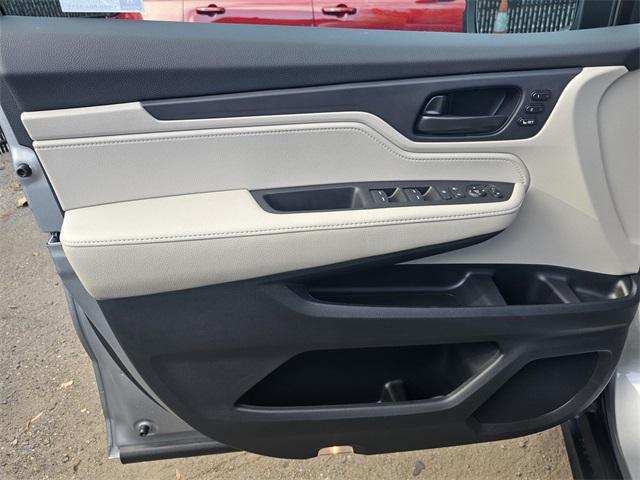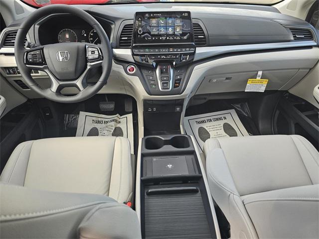 Silver Metallic 2026 Honda Odyssey EX-L 18'' Machine-Finished Alloy Wheels, 3rd row seats: split-bench, 4-Wheel Disc Brakes, 7 Speakers, ABS brakes, Adaptive Cruise Control: Adaptive Cruise Control (ACC) with Low-Speed Follow, Air Conditioning, Alloy wheels, AM/FM radio: SiriusXM, Anti-whiplash front head restraints, Apple CarPlay/Android Auto, Auto High-beam Headlights, Auto-dimming Rear-View mirror, Automatic temperature control, Blind Spot Information (BSI) System warning, Brake assist, Bumpers: body-color, Delay-off headlights, Driver door bin, Driver vanity mirror, Driver's Seat Mounted Armrest, Dual front impact airbags, Dual front side impact airbags, Electronic Stability Control, Exterior Parking Camera Rear, Four wheel independent suspension, Front anti-roll bar, Front Bucket Seats, Front dual zone A/C, Front fog lights, Front reading lights, Fully automatic headlights, Garage door transmitter: HomeLink, Heated door mirrors, Heated Front Bucket Seats, Heated front seats, Illuminated entry, Knee airbag, Lane departure: Lane Keeping Assist System (LKAS) active, Leather steering wheel, Leather-Trimmed Seats, Low tire pressure warning, Memory seat, Occupant sensing airbag, Outside temperature display, Overhead airbag, Overhead console, Panic alarm, Passenger door bin, Passenger seat mounted armrest, Passenger vanity mirror, Power door mirrors, Power driver seat, Power Liftgate, Power moonroof, Power passenger seat, Power steering, Power windows, Radio data system, Radio: 160-Watt AM/FM/HD/SiriusXM Audio System, Rear air conditioning, Rear anti-roll bar, Rear reading lights, Rear seat center armrest, Rear window defroster, Rear window wiper, Reclining 3rd row seat, Remote keyless entry, Security system, Speed control, Speed-sensing steering, Speed-Sensitive Wipers, Split folding rear seat, Spoiler, Steering wheel mounted audio controls, Tachometer, Telescoping steering wheel, Tilt steering wheel, Traction control, Trip computer, Turn signal indicator mirrors, and Variably intermittent wipers.