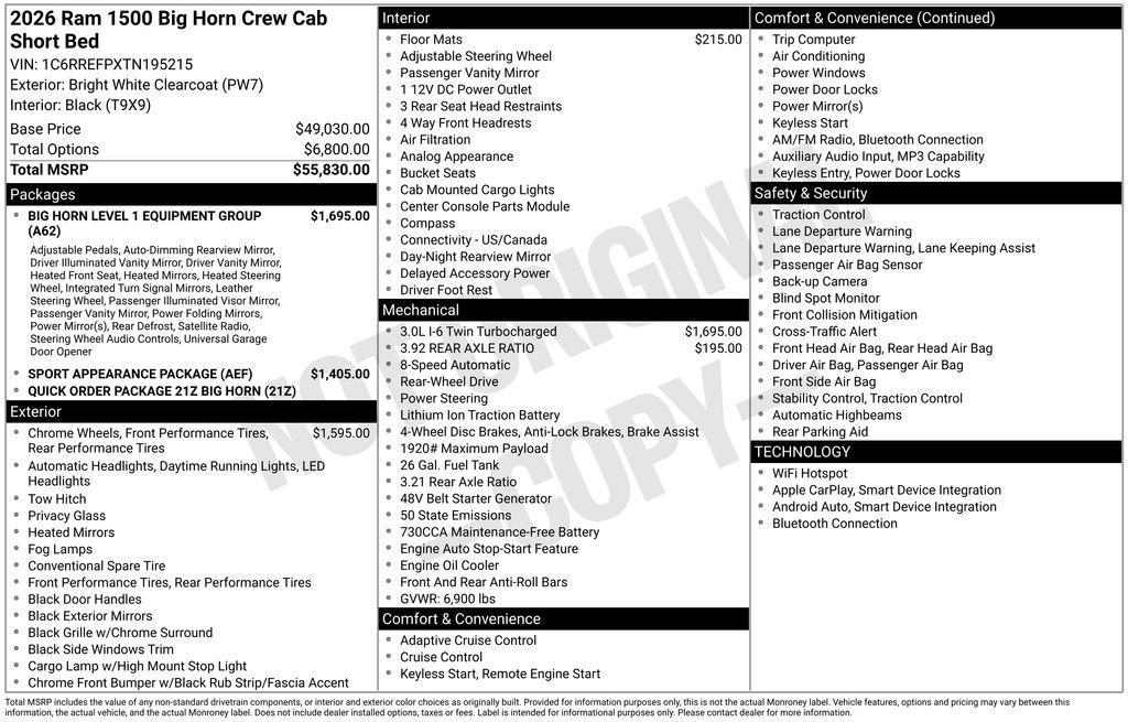 Power up your daily drive with the 2026 RAM 1500 Big Horn Crew Cab 4x2, finished in Bright White Clear Coat with a black deluxe cloth interior and enhanced by the bold Sport Appearance Package. This full-size truck combines refined styling, impressive power, and smart tech to meet the needs of work and play.Under the hood is the 3.0L I6 Hurricane SO Twin Turbo engine with stop start technology, delivering exceptional performance and efficiency. Paired with an 8-speed automatic transmission and upgraded with a 3.92 rear axle ratio, this RAM 1500 brings responsive acceleration and confident towing capability. Fuel economy is a solid 21 MPG combined, with up to 25 MPG highway.The exterior gets a muscular upgrade with the Sport Appearance Package featuring body-color front and rear bumpers, body-color door handles, and body-color fender flares. Chrome-clad 20-inch aluminum wheels wrapped in 275/55R20 all-season tires give this truck a commanding presence on the road. The Big Horn Level 1 Equipment Group adds premium features like a power-sliding rear window, automatic-dimming rearview mirror, power-adjustable pedals, heated power-folding mirrors, and a leather-wrapped heated steering wheel.Inside, the cabin is built for comfort and function with heated front seats, an 8-way power adjustable driver seat with lumbar support, steering-wheel-mounted audio controls, a rear 60/40 folding seat, and second-row in-floor storage bins. The Uconnect 5 system with an 8.4-inch touchscreen provides access to Apple CarPlay, Android Auto, SiriusXM with trial subscription, 4G LTE Wi-Fi hotspot, and Ram Connect services.Safety features are extensive and include full-speed forward collision warning plus, adaptive cruise control with stop and go, blind-spot and cross-path detection, lane management system, ParkSense front and rear park assist, ParkView rear backup camera, advanced brake assist, pedestrian emergency braking, trailer sway damping, and automatic high-beam headlamp control.With a Class IV receiver hitch, 400W inverter, rubber floor mats, and a 26-gallon fuel tank, this truck is ready for road trips, job sites, and everything in between. Built in Sterling Heights Michigan and backed by a 5-year or 60000-mile powertrain limited warranty and a 3-year or 36000-mile basic limited warranty, the 2026 RAM 1500 Big Horn Crew Cab 4x2 arrives with a total MSRP of \$58,025 including destination. Its a powerful and polished pickup ready to perform.Cape Coral CDJR is Southwest Florida's First Choice for Service, Selection, and $avings! We specialize in making sure you have the most convenient new vehicle buying experience with industry-leading customer service! For complete transparency, all advertised prices exclude taxes, tags, registration, $999.99 Pre-Delivery Fee, $399.99 Electronic Filing Fee, $49.50 Third Party Agency Fee, and Pre-Installed LoJack, Appearance Protection, and Etch Theft Deterrent totaling $1,397.00. See dealer for details. Price includes: $1000 - 2026 South BC Retail Bonus Cash . Exp. 11/03/2025 $3500 - 2026 National Retail Consumer Cash . Exp. 11/03/2025