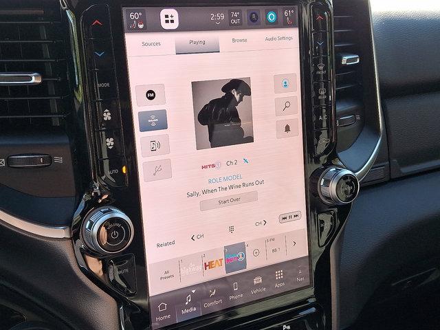 - BIG HORN LEVEL 2 EQUIPMENT GROUP -inc: SiriusXM Radio Service Power Adjustable Pedals Leather Wrapped Steering Wheel 12' Touchscreen Display Glove Box Lamp Auto Power-Folding Mirrors 115V Auxiliary Rear Power Outlet Media Hub w/2 Charge Only USBs Heated Front Seats Security Alarm Black Premium Power Mirrors Premium Overhead Console 9 Amplified Speakers w/Subwoofer Disassociated Touchscreen Display Body Color Fender Flares Remote Tailgate Release 115V Auxiliary Power Outlet LED Dome Lamp w/On/Off Switch Universal Garage Door Opener 2nd Row In Floor Storage Bins Sun Visors w/Illuminated Vanity Mirrors LED Footwell Lighting Rear Window Defroster Rear View Auto Dim Mirror Rear Power Sliding Window GPS Navigation Overhead LED Lamps Wheels: 20' x 9' Aluminum Chrome Clad (WRK) Tires: 275/55R20 OWL All Season Bridgestone Brand Tires Auto Dim Exterior Driver Mirror SiriusXM w/360L Connected Travel & Traffic Services Heated Steering Wheel Configurable Drive Mod