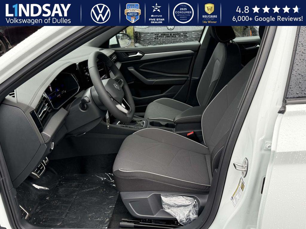 Pure White 2026 Volkswagen Jetta Sport FWD 8-Speed Automatic with Tiptronic 1.5L I-4 DI DOHC Turbocharged VOLKSWAGEN DIGITAL COCKPIT INSTRUMENT DISPLAY!, IQ.DRIVE PACKAGE - TRAVEL ASSIST (SEMI-AUTOMATED DRIVING ASSISTANCE), ADAPTIVE CRUISE CONTROL, LANE ASSIST, EMERGENCY ASSIST, FORWARD COLLISION WARNING & AUTONOMOUS EMERGENCY BRAKING, BLIND SPOT MONITOR W/ REAR TRAFFIC ALERT!, Active Blind Spot Monitor, Active Cruise Control, Auto-dimming Rear-View mirror, Automatic temperature control, Bumperdillo Rear Bumper Protection Plate in Black, Cloth Seat Trim, Electronic Stability Control, Emergency communication system: VW Car-Net Safe & Secure 5-year, Exterior Parking Camera Rear, Front dual zone A/C, Fully automatic headlights, Heated door mirrors, Heated Front Seats, Heavy Duty Trunk Liner w/VW CarGo Blocks, Illuminated entry, Leather Shift Knob, Leather steering wheel, Radio: MIB3 Composition Color w/8'' Touchscreen, Rain sensing wipers, Remote keyless entry, Rubber Monster Mats Kit (Set of 4), Split folding rear seat, Steering wheel mounted audio controls, Traction control, Wheels: 17'' 2-Tone Machined Alloy. 29/40 City/Highway MPG