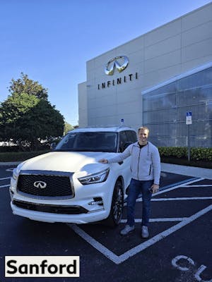 Our visit to the Sanford Infiniti dealership was absolutely fantastic. Although I walked in unhappy about an issue with my 2017 qx50, I drove away happy as a little girl in my 2025 brand new qx50 L absolutely fantastic. Although I walked in unhappy about an issue with my 2017 qx50, I drove away happy as a little girl in my 2025 brand new qx50 Luxe. Brandon and Mike were the ultimate professionals. Charming, knowledgeable and accommodating. I would wholeheartedly refer friends and family to them. So grateful to them for flipping an awful situation into a happy one. More