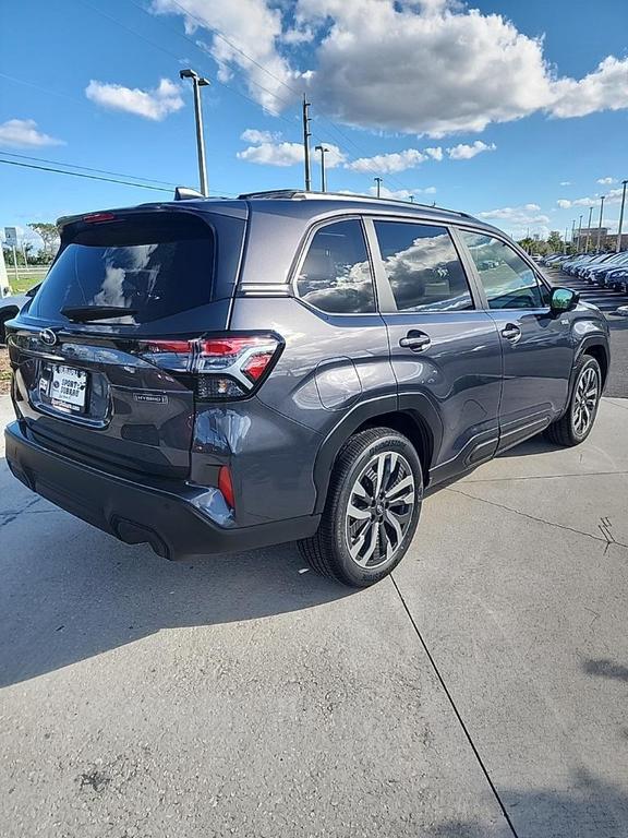 2.5L 4-Cylinder DOHC 16V, 11 Speakers, 4-Wheel Disc Brakes, ABS brakes, Air Conditioning, Alloy wheels, AM/FM radio: SiriusXM with 360L, Anti-whiplash front head restraints, Auto High-beam Headlights, Automatic temperature control, Brake assist, Bumpers: body-color, Compass, Driver door bin, Driver vanity mirror, Dual front impact airbags, Dual front side impact airbags, Electronic Stability Control, Emergency communication system: MySubaru Safety (3-year free trial), Exterior Parking Camera Rear, Four wheel independent suspension, Front anti-roll bar, Front Bucket Seats, Front Center Armrest, Front dual zone A/C, Front fog lights, Front reading lights, Fully automatic headlights, harman/kardon® Speakers, Heated & Ventilated Front Bucket Seats, Heated door mirrors, Heated front seats, Heated rear seats, Heated steering wheel, HVAC memory, Illuminated entry, Knee airbag, Low tire pressure warning, Memory seat, Navigation system: TomTom Navigation w/what3words, Occupant sensing airbag, Outside temperature display, Overhead airbag, Overhead console, Panic alarm, Passenger door bin, Passenger vanity mirror, Perforated Leather-Trimmed Upholstery, Power door mirrors, Power driver seat, Power Liftgate, Power moonroof: Panoramic, Power passenger seat, Power steering, Power windows, Radio data system, Radio: Subaru 11.6'' Multimedia Navigation System, Rear anti-roll bar, Rear seat center armrest, Rear window defroster, Rear window wiper, Remote keyless entry, Security system, Speed control, Speed-sensing steering, Split folding rear seat, Spoiler, Standard Model, Steering wheel mounted audio controls, Tachometer, Telescoping steering wheel, Tilt steering wheel, Traction control, Trip computer, Turn signal indicator mirrors, Variably intermittent wipers, Ventilated front seats, Wheels: 19'' x 7.5 J Dark Gray Aluminum-Alloy, 2.5L 4-Cylinder DOHC 16V.2025 Gray Subaru Forester Hybrid Touring 2.5L 4-Cylinder DOHC 16V 35/34 City/Highway MPG