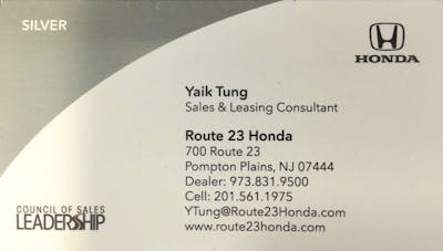 I had such a fantastic experience at Route 23 Honda. The process of buying my car was quick, easy, and completely stress-free. Yaik was a huge help from start to finish and kept me updated conveniently The process of buying my car was quick, easy, and completely stress-free. Yaik was a huge help from start to finish and kept me updated conveniently with text messages. George was also a pleasure to work with. He was very knowledgeable and friendly, and I truly appreciated that he didn't use any high-pressure tactics. A huge thank you to everyone for making this such a great experience. More