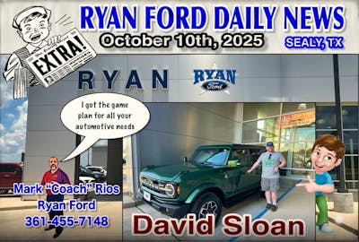 Huge thanks to Mark "Coach" Rios, Kyle with Finance, and Ryan Ford for helping our family get back on the road. Thank you for delivering great service and delivering our Bronco Sport from Sealy, TX to Kings Ryan Ford for helping our family get back on the road. Thank you for delivering great service and delivering our Bronco Sport from Sealy, TX to Kingsville, TX. More