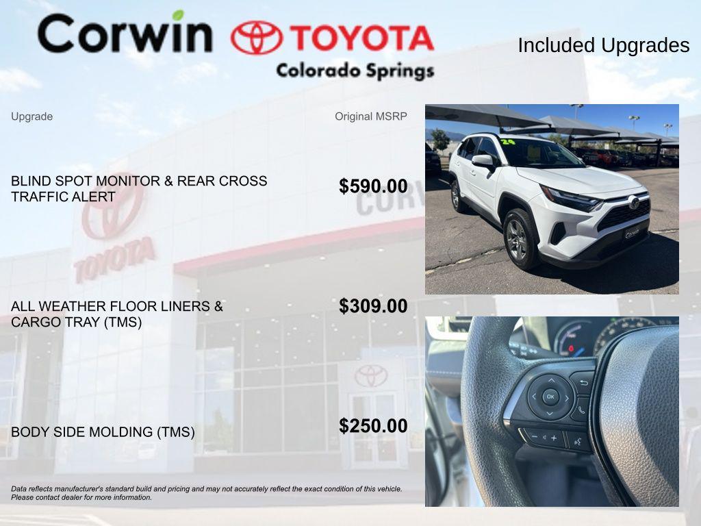 2024 Ice Cap/Midnight Black Metallic Toyota RAV4 Hybrid LE CARFAX One-Owner. Clean CARFAX.This Toyota RAV4 Hybrid is well equipped and includes the following features and benefits, AWD, Blind Spot Monitor w/ Rear Cross-Traffic Alert - Color-Keyed Heated Power Outside Mirrors w/ Turn Signal & Blind Spot Warning Indicators, 8-in. Toyota Audio Multimedia w/ 6-Speakers, Wireless Apple CarPlay & Android Auto Compatibility SiriusXM w/3-Month Platinum Plan Trial 3 USB Ports Dual Zone Auto A/C w/ Rear Air Vents Fabric-Trimmed Seats Remote Keyless Entry For Full Product Details, Please Visit Toyota.com/RAV4Hybrid Exterior LED Projector Headlights LED Daytime Running Lights 17-in. Five-Spoke Silver Alloy Wheels Exterior Dimensions Mechanical / Performance 2.5L 4-Cylinder Engine 219 Combined Net Horsepower Electronic Continuous Var. Tran. (ECVT) Electronic On-Demand All-Wheel Drive Safety and Convenience Toyota Safety Sense 2.5: Pre-Collision Sys w/Pedestrian Detection, Full-Speed Range Dynamic Radar Cruise Control, Lane Departure Alert w/Steering Assist, Lane Tracing Assist, Automatic High Beams, Road Sign Assist 8 Airbags; Star Safety System Connected Services Capable. 4G Network Dependent. See Toyota.com For Details. LATCH-Lower Anchor & Tether For CHildren Backup Camera w/ Dynamic Gridlines # Tony Divino Toyota 43019 777 West Riverdale Road, Riverdale, UT 84405 801.394.5701 Details Serial RU145632 Temp Serial RU19F713 Order Number 11610523 Engine Number A25ARB81573 Wholesale dealer 43848 Previous dealer 43848 Allocation 03Z Port PDS No Damage No TRAC No Fleet Yes Invoice Date 05/21/2024 Stock Number N/A D. Odometer is 3712 miles below market average! 41/38 City/Highway MPGFriendly service, a huge selection of new Toyota vehicles, and fast flexible financing options are a few of the reasons why we are the new and pre-owned vehicle leaders in the greater Colorado Springs Area. Call us or stop in and see us today at Corwin Toyota Colorado Springs! Located at 5115 New Car Dr. Colorado Springs, CO 80923. (719) 598-2222 or visit us online at CorwinToyotaColoradoSprings.com. All prices must be verified with the dealer.