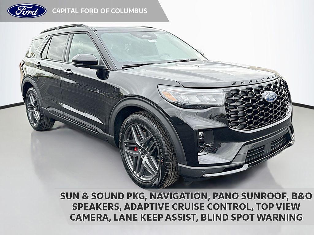 Agate Black Metallic 2026 Ford Explorer ST 4D Sport Utility 4WD 10-Speed Automatic 3.0L EcoBoost V64WD, 3rd row seats: bench, Apple CarPlay/Android Auto, Auto High-beam Headlights, Automatic temperature control, Equipment Group 400A Standard Package, Front dual zone A/C, Front fog lights, Fully automatic headlights, Heated front seats, Heated rear seats, Heated steering wheel, Memory seat, Multicontour Seats w/Front Active Motion, Navigation System, Panoramic Fixed Glass Roof w/Power Shade, Power driver seat, Power Liftgate, Power passenger seat, Radio: B&O Sound System by Bang & Olufsen w/51G, Rear air conditioning, Remote Control Front Windows, Sun and Sound Package, Ventilated front seats, Wheels: 21'' Magnetite-Painted Aluminum, 10 Speakers, 4-Wheel Disc Brakes, ABS brakes, Air Conditioning, Alloy wheels, AM/FM radio: SiriusXM with 360L, Auto-dimming door mirrors, Auto-dimming Rear-View mirror, Brake assist, Bumpers: body-color, Compass, Delay-off headlights, Driver door bin, Driver vanity mirror, Dual front impact airbags, Dual front side impact airbags, Electronic Stability Control, Emergency communication system: 911 Assist, Exterior Parking Camera Rear, Four wheel independent suspension, Front anti-roll bar, Front Bucket Seats, Front Center Armrest, Front reading lights, Garage door transmitter, Heated door mirrors, Heated/Ventilated Miko Captain's Chairs, Illuminated entry, Knee airbag, Leather steering wheel, Low tire pressure warning, Occupant sensing airbag, Outside temperature display, Overhead airbag, Overhead console, Panic alarm, Passenger door bin, Passenger vanity mirror, Power door mirrors, Power steering, Power windows, Rain sensing wipers, Rear anti-roll bar, Rear reading lights, Rear window defroster, Rear window wiper, Remote keyless entry, Security system, Speed control, Speed-sensing steering, Speed-Sensitive Wipers, Split folding rear seat, Spoiler, Sport steering wheel, Steering wheel mounted audio controls, Tachometer, Telescoping steering wheel, Tilt steering wheel, Traction control, Trip computer, Turn signal indicator mirrors, Variably intermittent wipers, BlueCruise, subscription required, Power folding side mirrors, Around view camera, Co-Pilot360 Active2.0, Remote start, Lane keep assist, Lane departure warning, Forward collision warning, Front & Rear parking sensors, Adaptive cruise control, Blind spot warning, Keyless start, 4WD, 3rd row seats: bench, Apple CarPlay/Android Auto, Auto High-beam Headlights, Automatic temperature control, Equipment Group 400A Standard Package, Front dual zone A/C, Front fog lights, Fully automatic headlights, Heated front seats, Heated rear seats, Heated steering wheel, Memory seat, Multicontour Seats w/Front Active Motion, Navigation System, Panoramic Fixed Glass Roof w/Power Shade, Power driver seat, Power Liftgate, Power passenger seat, Radio: B&O Sound System by Bang & Olufsen w/51G, Rear air conditioning, Remote Control Front Windows, Sun and Sound Package, Ventilated front seats, Wheels: 21'' Magnetite-Painted Aluminum. Price includes: $1000 - 2025 First Responder Recognition Exclusive Cash Reward. Exp. 01/05/2026