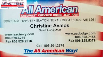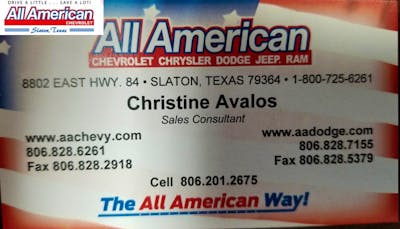 Best in West Texas I would like to start with saying, Thank You to Christine Avalos for the excellent service, hard work, and dedication she put into finalizing our vehi I would like to start with saying, Thank You to Christine Avalos for the excellent service, hard work, and dedication she put into finalizing our vehicle. We couldn't ask for a friendlier staff at All American thank you all for your help. We are greatfull to you all especially Christine. She is one in a million. All American is very lucky to have such a great person working for them. Keep up the excellent service. And again THANK YOU. More