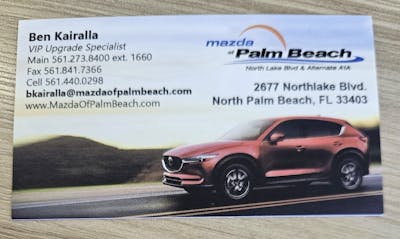 I can’t say enough good things about my experience at Mazda of Palm Beach. From start to finish, everyone I worked with went above and beyond. My sales consultant, Jordan, was patient, kind, and really l Mazda of Palm Beach. From start to finish, everyone I worked with went above and beyond. My sales consultant, Jordan, was patient, kind, and really listened to what I needed. I’ll admit, my stipulations were pretty tough to meet, but instead of brushing me off or pressuring me, he put in the effort to make it work. The sales manager, Jesus, checked in throughout the process. He stepped in and set realistic expectations while also finding a reasonable compromise that worked for me, which I really appreciated. When it came time for financing, Matt, explained everything clearly and worked hard to find the best deal possible. The whole process, which I usually dread, ended up being smooth and stress-free. What stood out most was everyone’s sincerity. I never felt rushed, pressured, or like just another customer. They earned my trust, and a return customer. Thank you. More