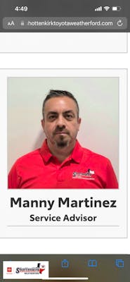 Manny Martinez is always a pleasure to work with at Shottenkirk Toyota in Weatherford. Every time I come in, he greets me with a genuine smile and consistently provides positive, professional service Shottenkirk Toyota in Weatherford. Every time I come in, he greets me with a genuine smile and consistently provides positive, professional service. Manny takes the time to explain things clearly, and I truly trust his advisement when it comes to my vehicle. It’s rare to find someone who combines professionalism with such a welcoming attitude. Manny has become one of my favorite employees there, and his customer service is a big reason I feel confident returning to this location. Thank you, Manny, for always making the experience a good one. More