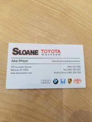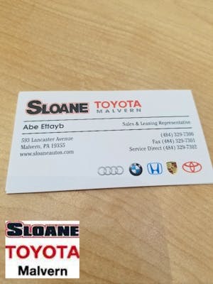 GREAT SERVICE WITH A PROFESSIONAL MANNER Abe Ettayb, salesmen at Sloan Toyota of malvern is very helpful, professional with good manner. Thank you Abe for your great service. This is my 2nd Abe Ettayb, salesmen at Sloan Toyota of malvern is very helpful, professional with good manner. Thank you Abe for your great service. This is my 2nd Corolla that I bought from you and suggested my friends to go there which both of them bought from you too (highlander and rav 4). More
