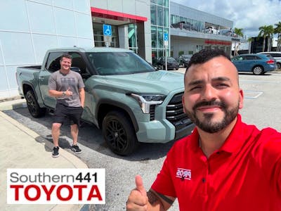 My sales rep, Alvaro, made purchasing my new Tundra quick and easy. While the model I was looking for wasn't available when I first came into the dealership, they found one pretty quickly and was able to wor and easy. While the model I was looking for wasn't available when I first came into the dealership, they found one pretty quickly and was able to work around my schedule for pickup. Love my truck so far and happy I bought through Southern 441. More